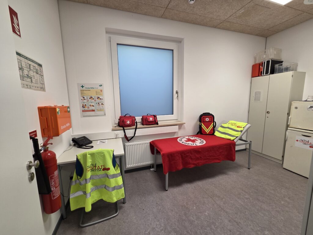 Sie haben eine verantwortungsvolle Aufgabe an unserer Schule und arbeiten eng mit dem Sekretariat zusammen. Ausgestattet mit dem Sani-Handy versorgen sie in der Pausenzeit verletzte Schüler_innen und aktualisieren regelmäßig alle Verbandskästen der Schule. Manchmal werden sie auch während des Unterrichts zu Einsätzen gerufen. Auch bei größeren Schulveranstaltungen zeigen die Sanis Präsens.