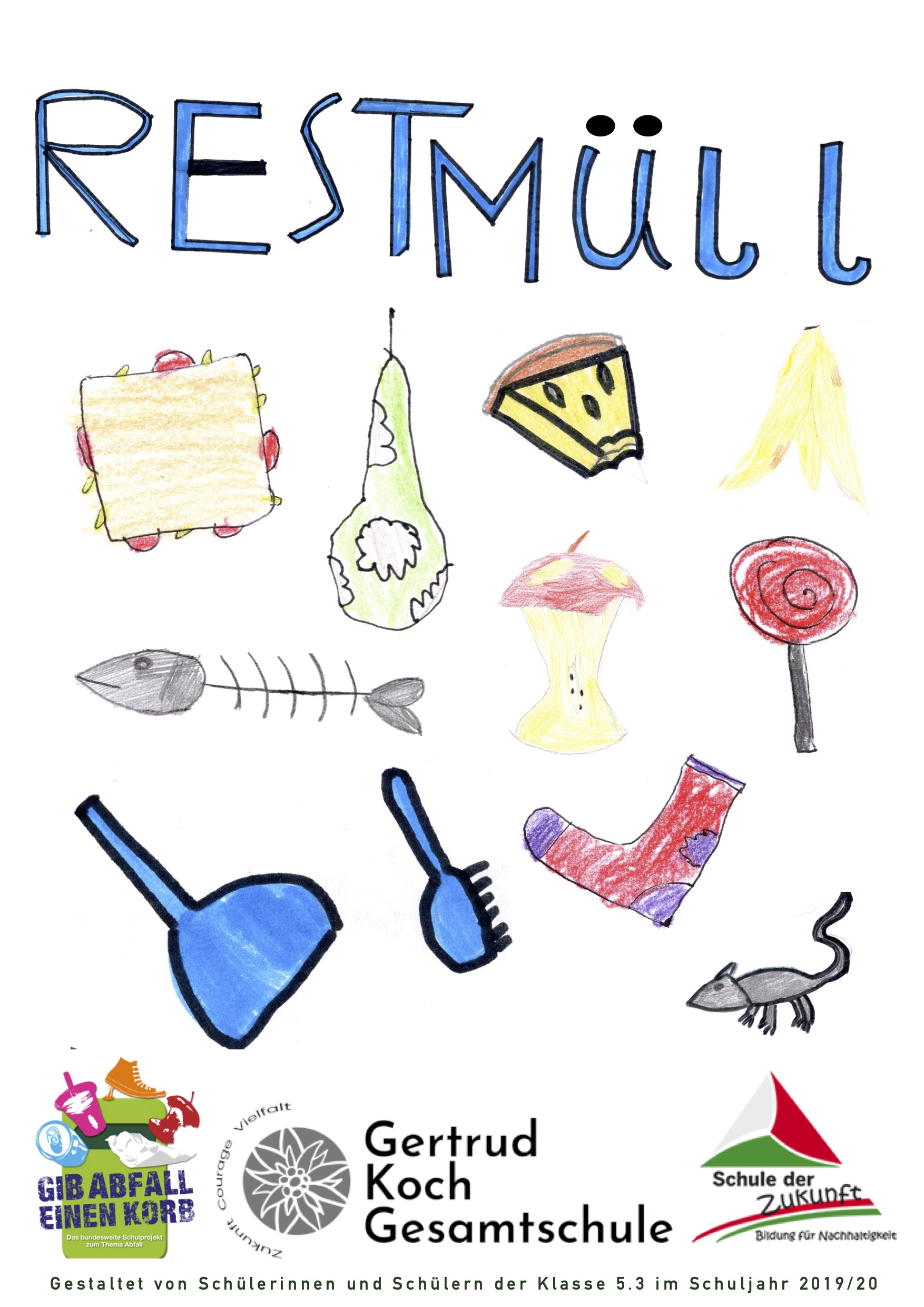 Die Plakate zur Mülltrennung wurden von Schülerinnen und Schülern der Klasse 5.3 im Schuljahr 2019/20 gestaltet, die an dem Wettbewerb „Gib Abfall eine Korb“ teilgenommen haben.