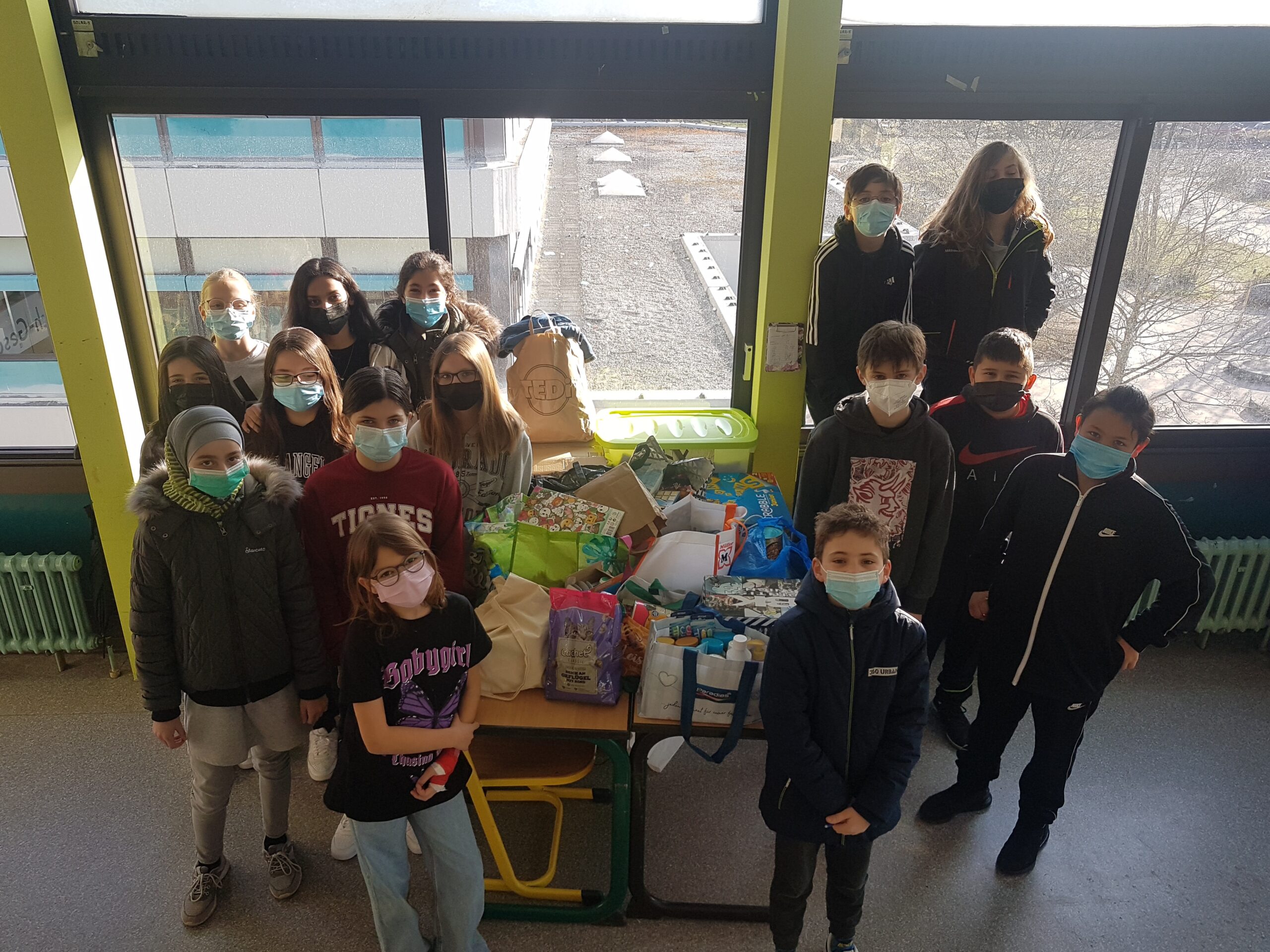 Die Klasse 5.1 hatte die Idee, Spenden für die Ukraine zu sammeln. Anfang März hat sie angefangen, dazu Plakate zu gestalten und in der Schule aufzuhängen. Am Freitag den 11.03. trafen die ersten Spenden in der Klasse 5.1 ein. Über eine Woche kamen sehr viel Sach- und Geldspenden an.